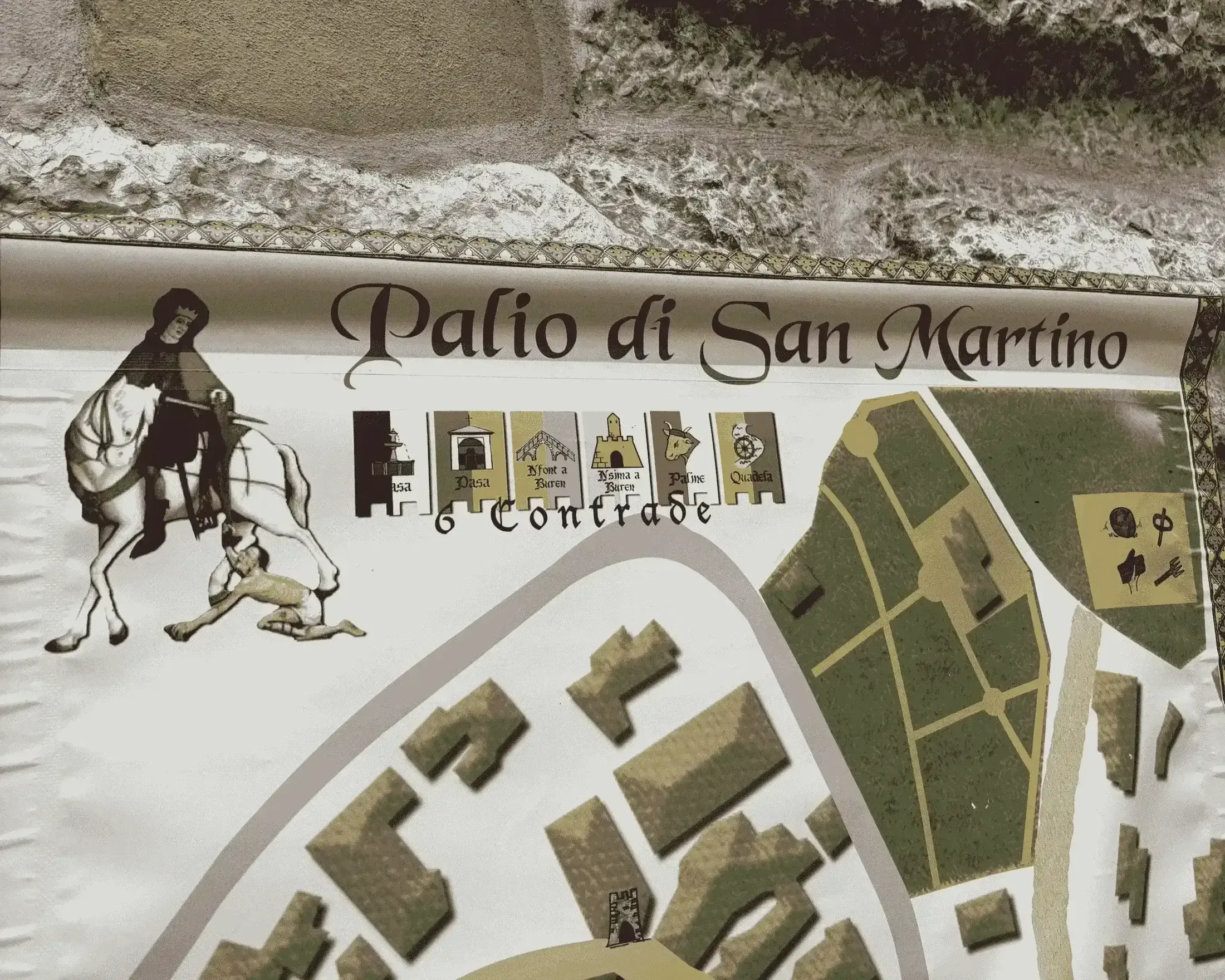 Al centro del Palio di San Martino, come intuibile, ci sono le sei contrade del paese, Ciàsa, Dàsa, N’font a Buren, N’sima a Buren, Paline e Quadela: ognuna rappresenta un’area storica o un’identità comunitaria e compete in una serie di giochi tradizionali che richiedono agilità, strategia e spirito di squadra. Tra le prove più note e tipiche? Il tiro del borel, la corsa del formaggio e la pallacorda. Complessivamente il palio prevede diciassette giochi, distribuiti su più giornate, alternando momenti di competizione a banchetti e celebrazioni nella piazza storica.